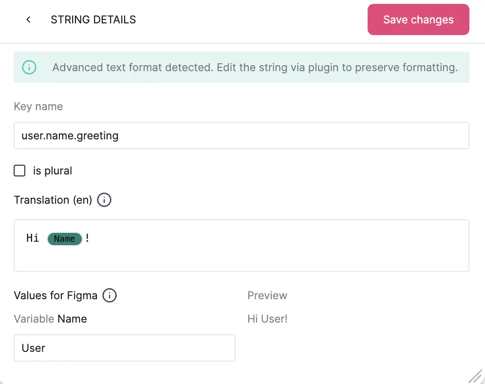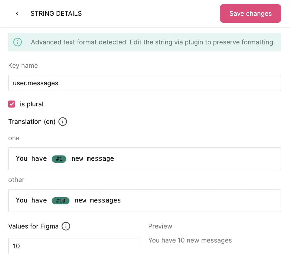 In the String details page, you can also mark a string as plural by checking the Plural checkbox. This allows to define two different texts. One for a singular form, and the other for more the amount grater than one. It is also possible to add one for a zero. In the "Values for Figma" field, you can set a default value that will be shown in Figma so you can work with the design with the text and see an example. The "Values for Figma" works for both variables and plurals alike.